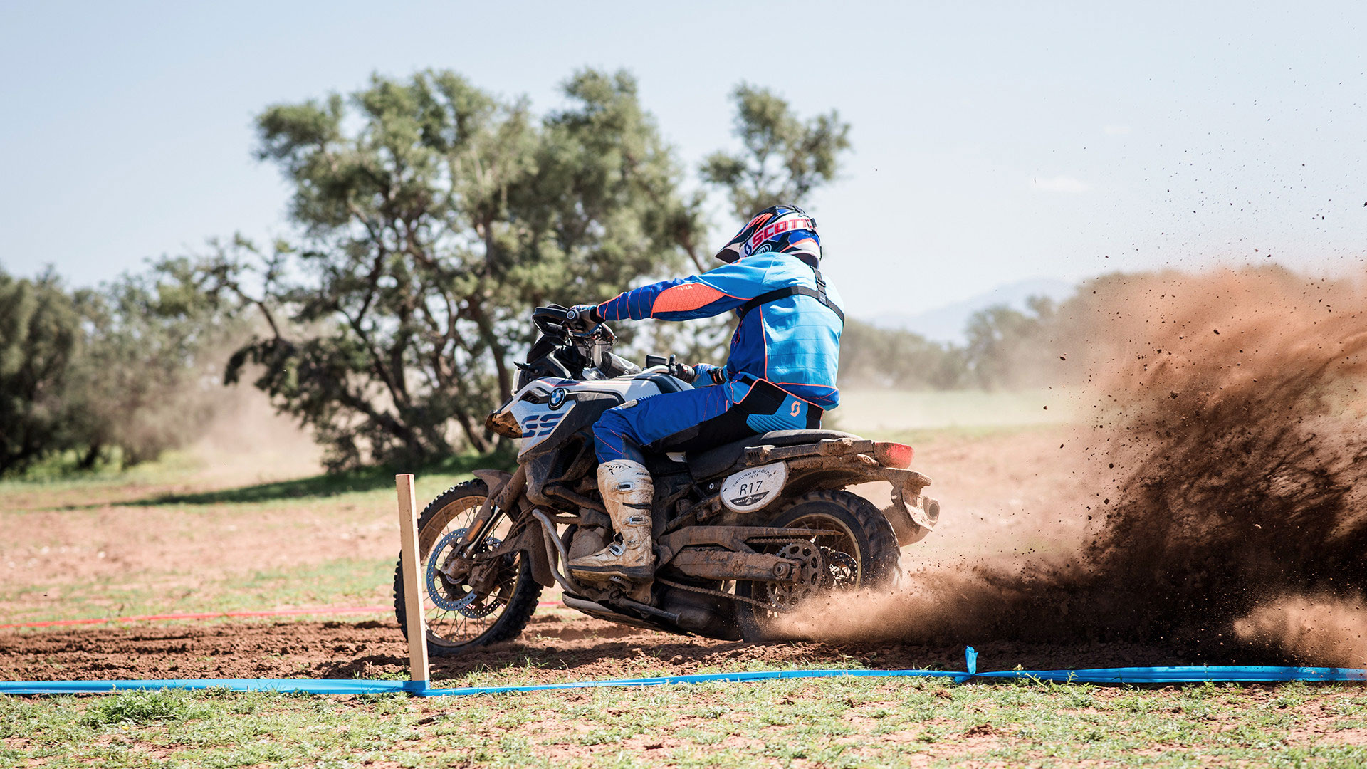 Desde la ciudad portuaria marroquí de Agadir, la ruta Enduro lleva a los ciclistas a Tafraout, ubicada al sureste, antes de continuar hacia el oeste hacia Tiznit, en las estribaciones de la cordillera Anti-Atlas. Las etapas de cuatro días son de diferentes longitudes, con distancias que van desde 174 a 239 kilómetros. El segundo día comienza para Dirk en Tafraout. Poco después del comienzo, hay una prueba especial antes de ingresar a la cordillera con una gran cantidad de escaladas rocosas. "Llevo mis límites en la prueba especial, manejando agresivamente y al mismo tiempo con cuidado, para poder sacar el máximo provecho de mi máquina. Luego someto el material al estrés y la motocicleta también tiene que sufrir. En última instancia, es una cuestión de tiempo ". En las pruebas especiales en superficies arenosas, Dirk cosecha los beneficios de la tracción del GS. Cuando está fuera de la carretera, cambia al modo Enduro Pro. "La motocicleta es extremadamente fácil de manejar con la rueda trasera. Independientemente de la superficie, tengo la sensación de que la F 850 GS puede guiarse limpiamente y de manera controlada donde el conductor lo desee.