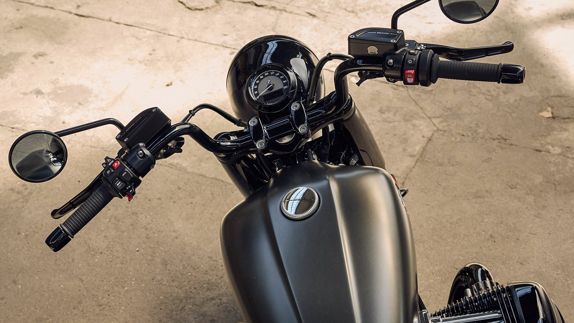 El icónico frontal, con faros LED redondos y llantas de fundición de aluminio de 21 pulgadas, señala el camino hacia el horizonte. Pon tus manos tranquilamente en el Apehanger midi y coloca los pies en los estribos de serie, mientras el asiento dragster te ofrece una sujeción perfecta para trayectos largos. La silueta alargada bagger encaja perfectamente con la parte de atrás que marca el estilo con las maletas de carcasa rígida. Esta moto es inconfundible. Inconfundible: el sonido único del Boxer que sale del llamativo silenciador final de color cromo oscuro.